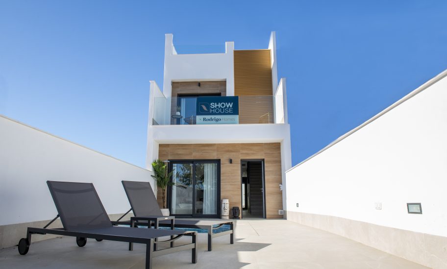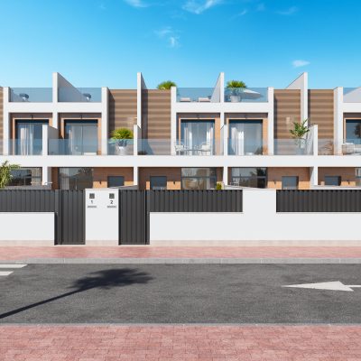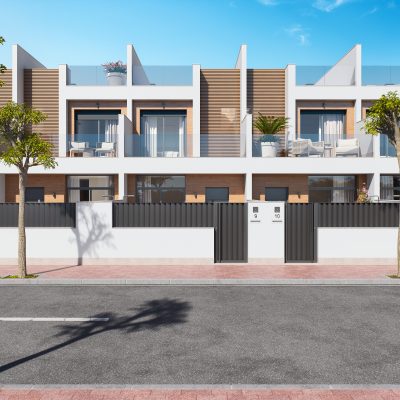 Przedstawiamy Państwu osiedle 8 niezależnych willi i domów w zabudowie bliźniaczej w San Pedro Pinatar, wszystkie z prywatnym basenem, tarasem, solarium i miejscem parkingowym na działce.