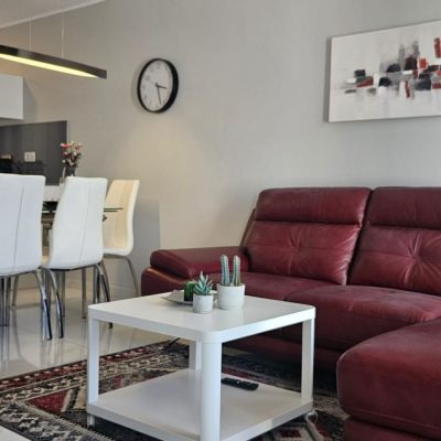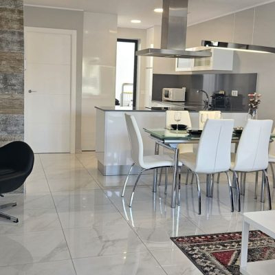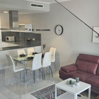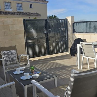Na wejściu wita nas przestronny i jasny salon, który ma całkowicie otwarty plan na kuchnię. W salonie jest miejsce na część wypoczynkową i jadalnię. Kuchnia jest w pełni wyposażona i ma dobre miejsce do przechowywania. Na parterze znajduje się jedna z trzech sypialni z wbudowaną szafą. Schody prowadzą do pozostałych 2 sypialni z łazienkami i wbudowanymi szafami. Na uroczym tarasie na dachu jest mnóstwo miejsca na leżaki i część wypoczynkową. Stamtąd roztacza się piękny widok na całą okolicę. W okolicy znajduje się wspólny basen i plac zabaw dla mniejszych dzieci.